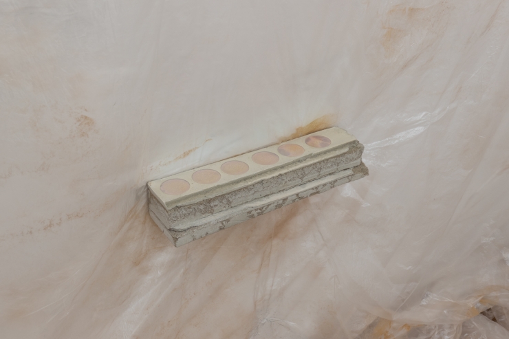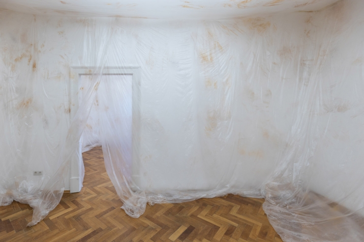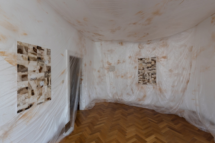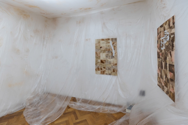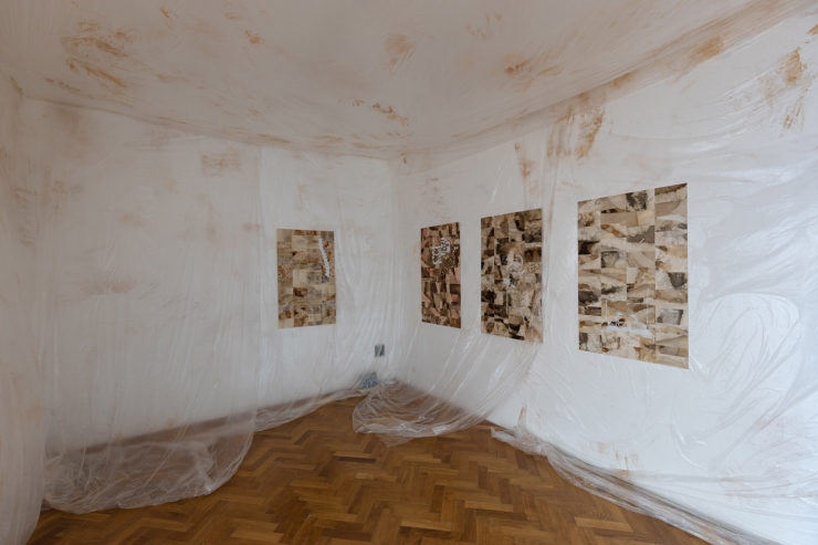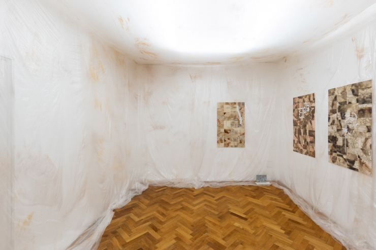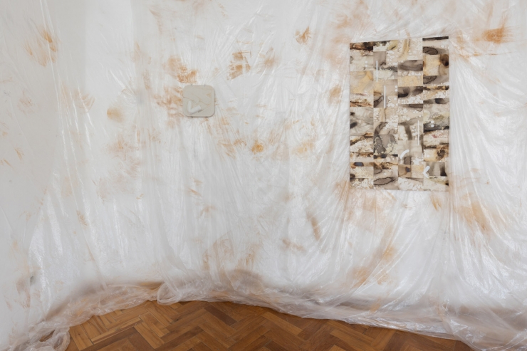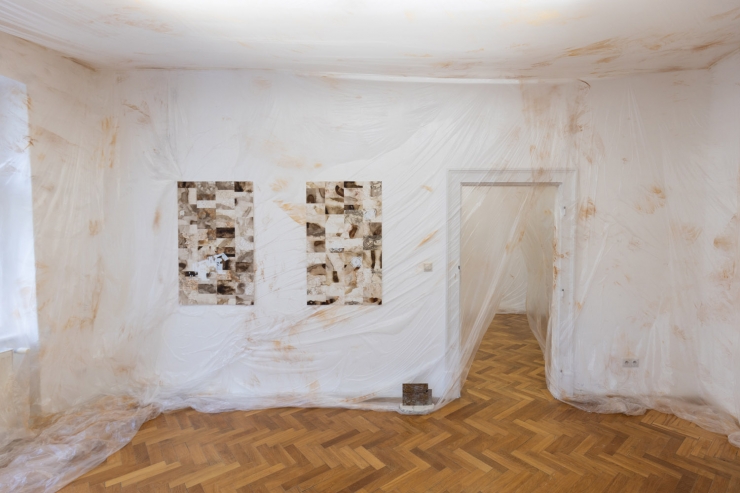 When entering Thresholds and Their Phantoms the atmosphere of the space seems provisional. The sensory experience is estranging since the walls are covered with subtle sprayed, thin plastic sheets. Here, she is showing new partially printed collages called Die Vorläufigkeit der Übertragung (The provisional nature of the transmission). They are made of papers treated with potato juice; and deal with point of connection where information is converted and transmitted. Is this happening in a 1:1 form? Or what are the cumulative errors and information falsifications? Reifying these processes and thoughts, I'll show concrete objects, which have a rather constructed architectural look and feel.