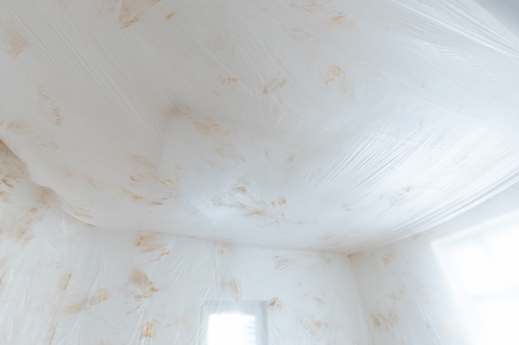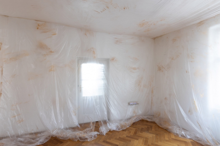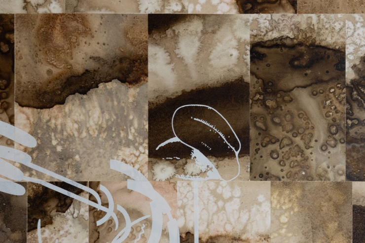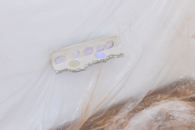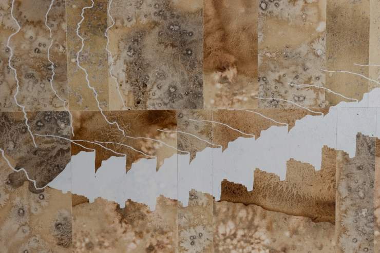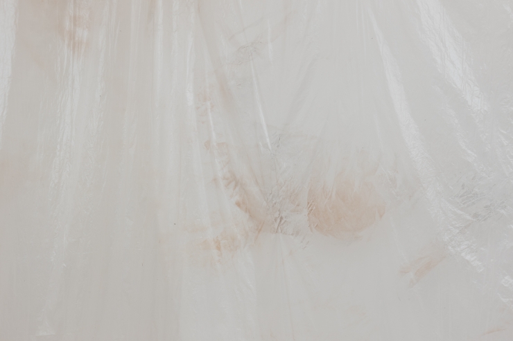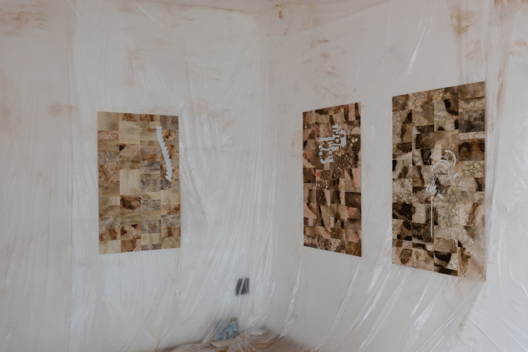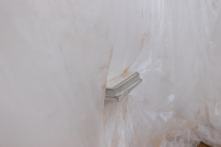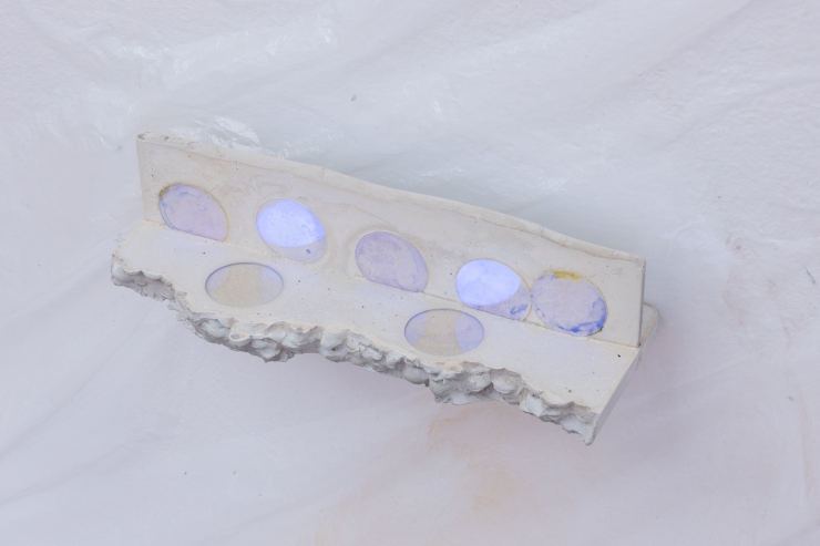 When entering Thresholds and Their Phantoms the atmosphere of the space seems provisional. The sensory experience is estranging since the walls are covered with subtle sprayed, thin plastic sheets. Here, she is showing new partially printed collages called Die Vorläufigkeit der Übertragung (The provisional nature of the transmission). They are made of papers treated with potato juice; and deal with point of connection where information is converted and transmitted. Is this happening in a 1:1 form? Or what are the cumulative errors and information falsifications? Reifying these processes and thoughts, I'll show concrete objects, which have a rather constructed architectural look and feel.